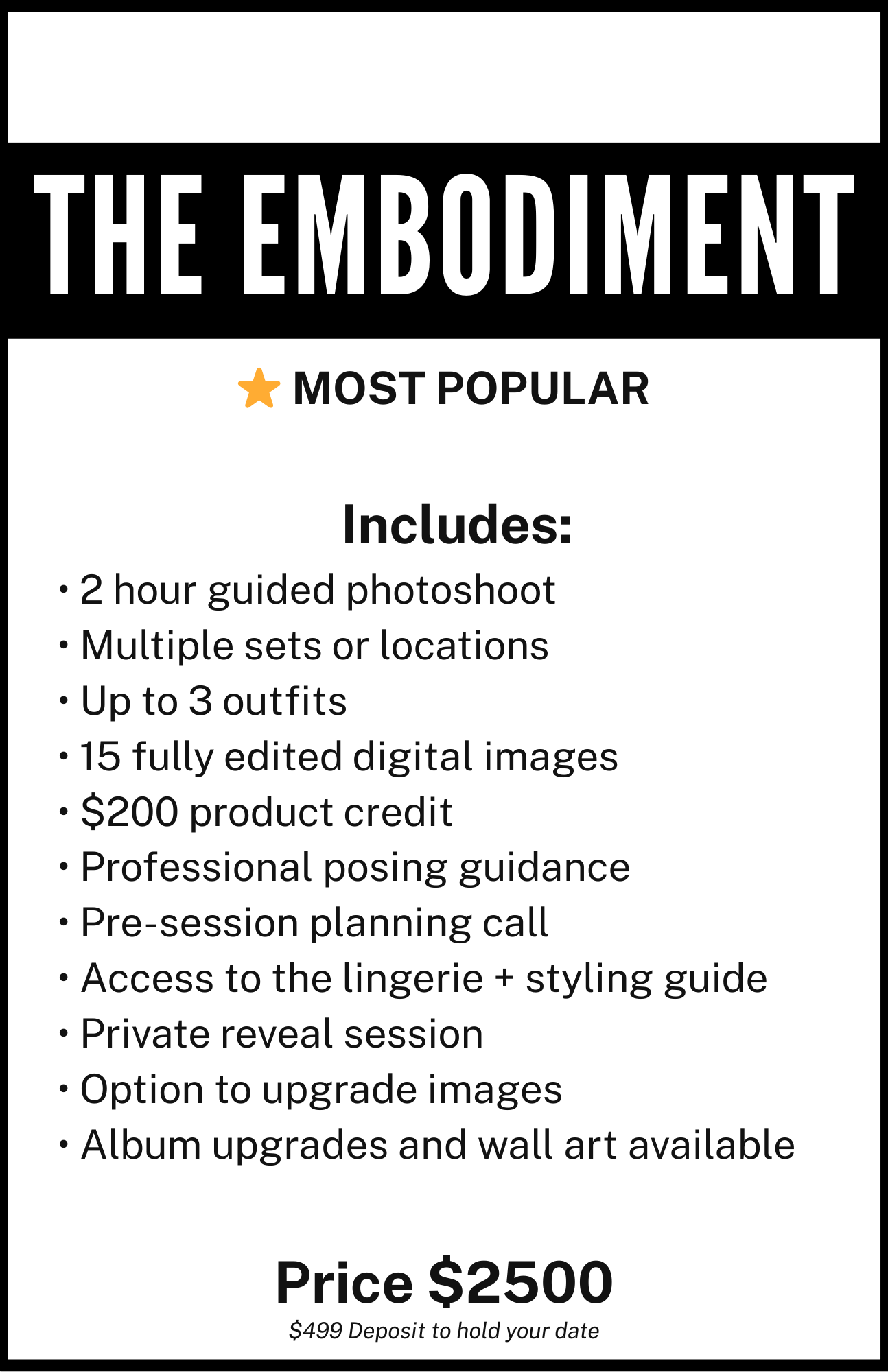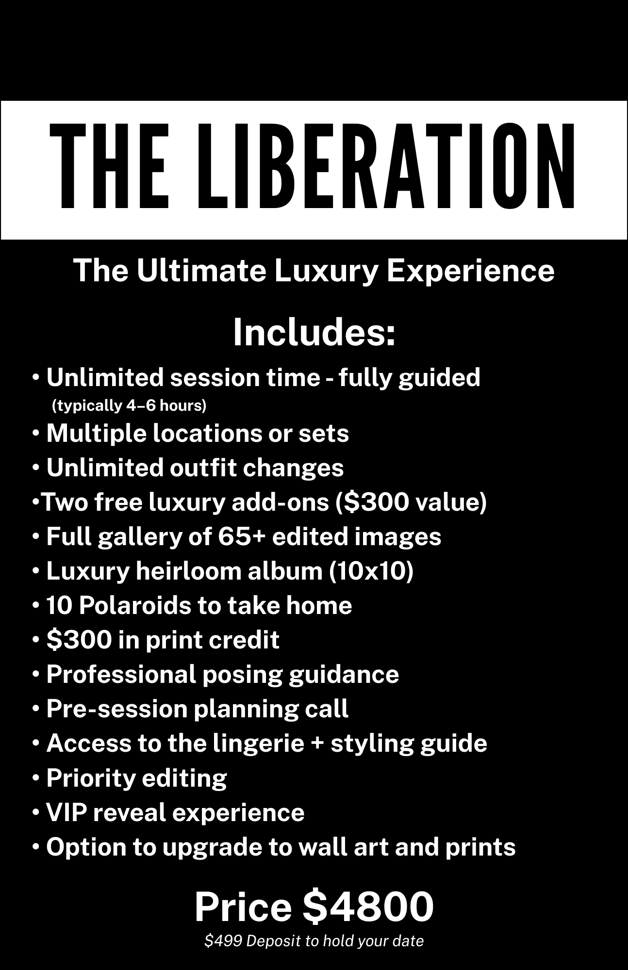 Every experience includes expert posing guidance, pre-session planning, a private reveal session, and the chance to witness yourself in a way you may never have before.