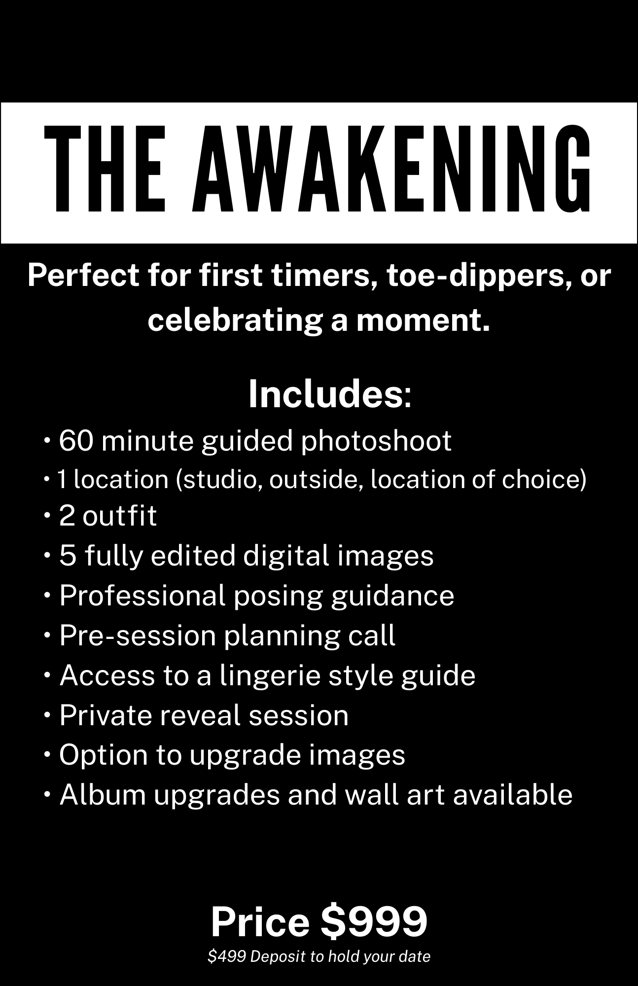Every experience includes the same transformative foundation of expert posing guidance, pre-session planning, a private reveal session, and the chance to witness yourself in a way you may never have before.